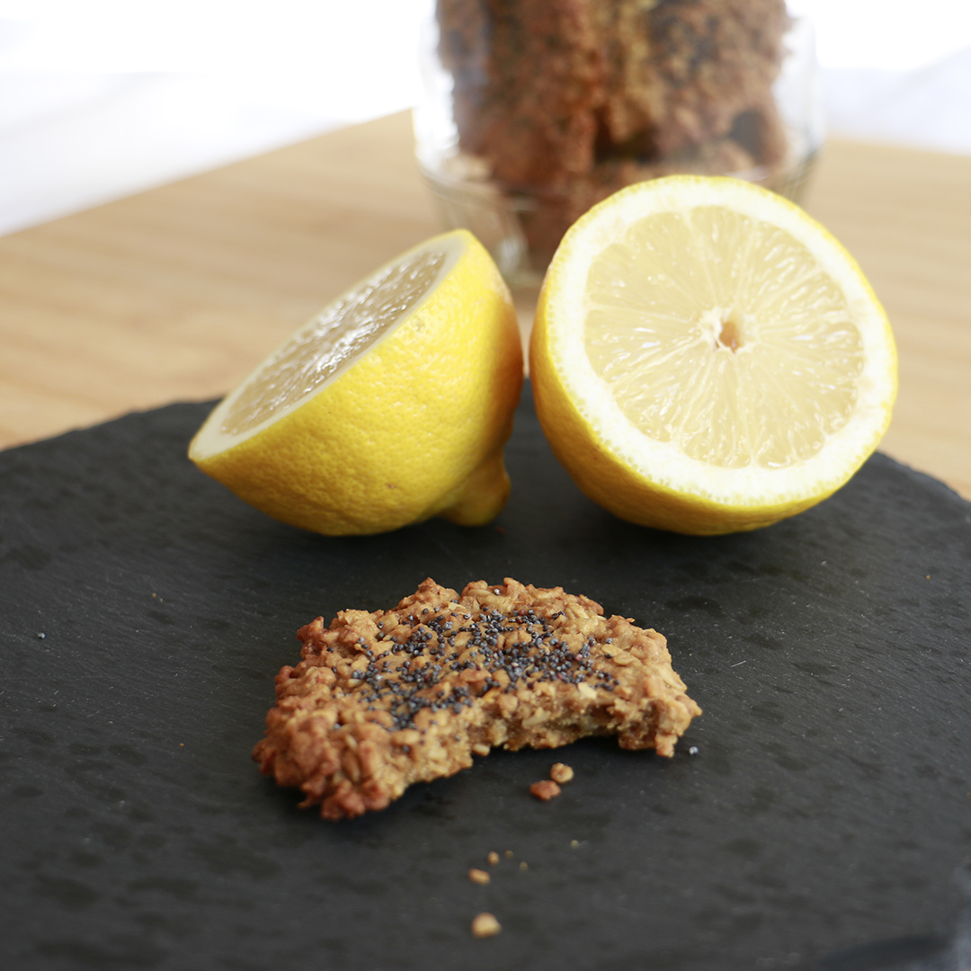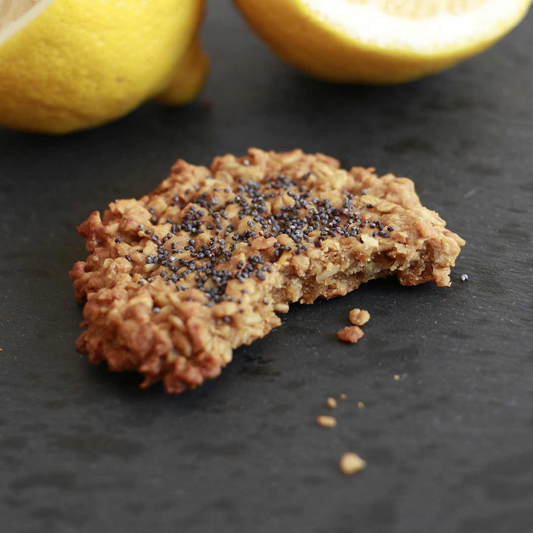 Ingredientes: Farinha de arroz, água, limão, açúcar de coco*, aveia*, azeite virgem extra, sementes de papoila.